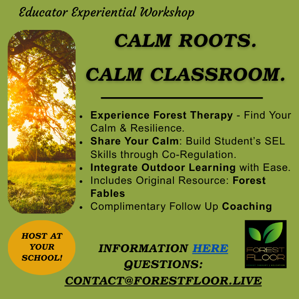 Strategies and resources to integrate calming elements of Forest Therapy into the classroom to enhance mental health & well being of educators and students.